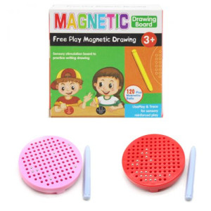 Магнитная игра сделана в форме круглой доски. С помощью такой игры можно создавать бесконечное количество рисунков. В комплекте: 120 магнитов (в ячейках), ручка (с магнитом на конце). Чтобы создать рисунок достаточно поднести ручку к пустой ячейке и с, помощью магнита, поднимется шарик, который заполнит ячейку. Надавив на шарик пальцем или ручкой можно стереть рисунок. Игрушка помогает развивать логику, усидчивость, мелкую моторику рук и воображение. Досточка выполнена из прочного пластика. В ассортименте игры разных цветов.