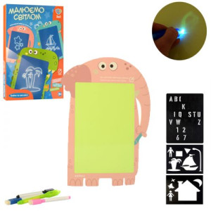 Интересный детский набор 'Рисуем светом'. Комплект состоит из: доски-планшета для рисования, маркер-светодиод, 3 маркера с губкой-ластиком, 3 трафарета (картинки, буквы английского алфавита и цифр). Интересная игрушка для рисования в темноте – маркер имеет светодиод, который является источником света для рисования, маркер должен быть направлен на люминесцентную поверхность планшета, что позволит производить любые рисунки. В течение 5-15 мин яркость рисунка пропадает и поверх предыдущего можно рисовать следующий. Планшет выполнен из ПВХ, толщиной 0,5мм.