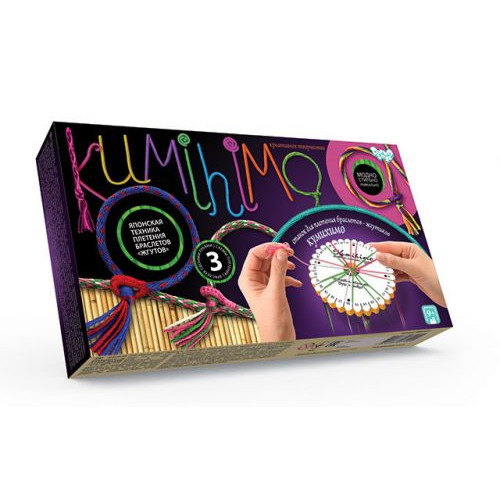 Набор для креативного творчества 'KUMIHIMO' (Кумихимо). Кумихимо – японское ремесло плетения шнуров, лент и тесьмы из цветных шелковых нитей. Для плетения используются приспособления в виде дисков или квадратных пластин в зависимости от желаемого результата. Станок с диском называется марудай (используется для плетения круглых шнуров), станок с квадратной пластиной – такадай, на нем плетут плоские шнуры (типа тесьмы). При помощи набора, Вы можете создать 3 браслета своими руками.