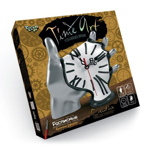 Набор креативного творчества 'Time Art'. Пенополистироловая 3D форма для росписи, акриловые краски 3 цвета (белая, черная, серебристая). После того как заготовка окрашена, необходимо собрать часы. В наборе, кроме заготовки, есть: часовой механизм, втулка, гайка с резьбой, шайба, часовая стрелка, минутная стрелка, секундная стрелка.