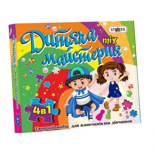 Игровой набор для мальчиков и девочек, в который входит 4 игры и творческие задания: картина из пайеток, настольная игра, создание объемных фигурок, пазл.