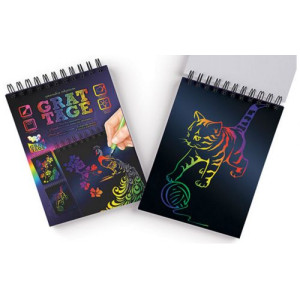 Набор для творчества 'GRATTAGE' А6. Гратаж - это способ выполнения картины, методом процарапывания изображения на картоне острым инструментом. Снимая штихелем слой защитной краски проявляется яркий и оригинальный рисунок. Блокнот содержит три заготовки с контурами и три заготовки для индивидуальных и творческих открытий.