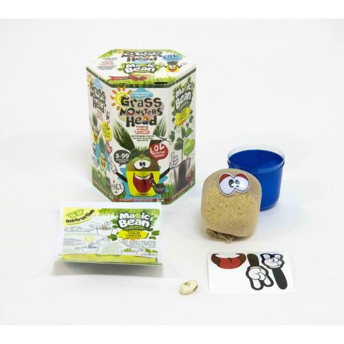 Набор креативного творчества 'Grass Monsters Head'. Игрушка, в виде питомца , за которым нужно ухаживать. Все что нужно - лучи солнца и ежедневый полив, и через время игрушка обзаведется пышной растительностью на голове. Делайте любимцу оригинальную прическу и украшайте стаканчик прикольными стикерами. Кроме того, в наборе есть 'Magic Bean (волшебный боб)'. Посадив и вырастив боб на его поверхности Вы увидите 'надпись-сюрприз'.