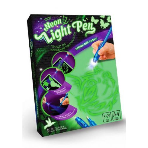 Набор креативного творчества 'Neon Light Pen' (Рисуй светом). На планшете лучше рисовать в темноте, с помощью трафаретов, либо используя собственную фантазию и креативное мышление. Так же, 'волшебная ручка' пишет специальными невидимыми глазу чернилами. Увидеть написанное можно только посветив ультрафиолетом.