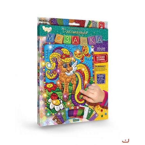 Набор для творчества 'Блестящая мозаика'. Развивает креативное мышление, творческие способности, художественный вкус. Инструкция: 1) Берем картинку и палетку с наклейками; 2) Подбираем палетки с наклейками согласно номерам, указанным на коробке; 3) Отделяем кубики-наклейки от палеток и клеим их на указанные номера картинки; 4) Из оставшихся наклеек оформляем рамку к готовой мозаике. Без клея и ножниц. Размер картинки - 20,5 х 26 см.