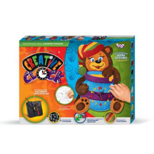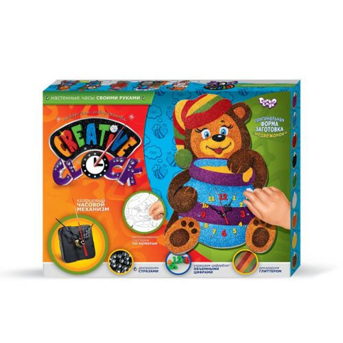 Комплектация: Форма-заготовка, комплект страз, набор разноцветного глиттера, часовой механизм со стрелками, объемные разноцветные цифры, инструкция
