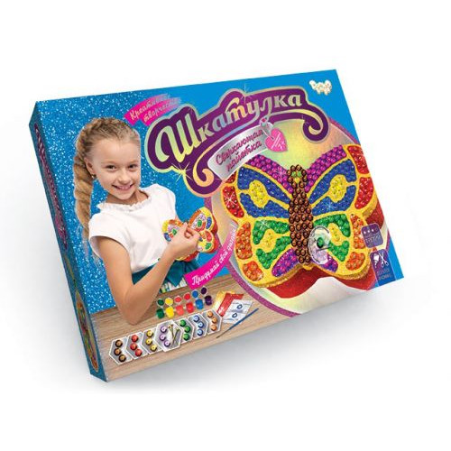 Комплектация: Шкатулка, краска (6 цветов), кисточка, комплект пайеток, набор гвоздиков-пинов, акриловый лак, глисттерные блестки, инструкция