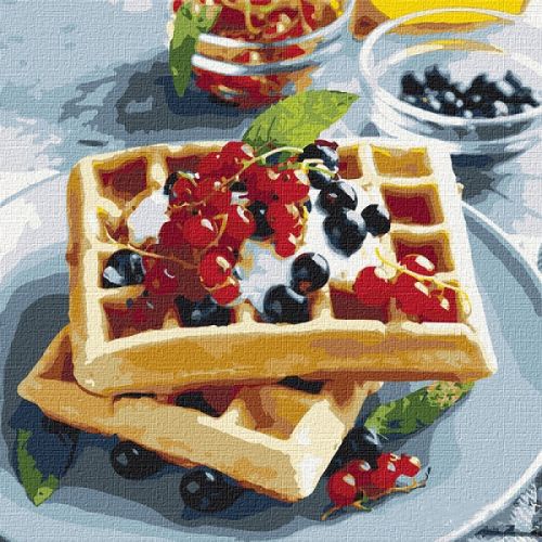 Картина по номерам 'Бельгийские вафли с ягодами'. Для того чтобы нарисовать картину, необходимо рисовать по пронумерованным контурам, которые соответствуют цвету краски. В наборе: натуральный холст на подрамнике с галерейной натяжкой, бумажная копия с контурным рисунком картины (на картине нанесена схема контуров изображения с нумерацией), 2 нейлоновые художественные кисти, палитра акриловых красок в контейнерах. Все необходимые краски уже в комплекте и не требуют смешивания. Размер: 30 х 30 см. Количество цветов: 22. Сложность - ★★★★★.