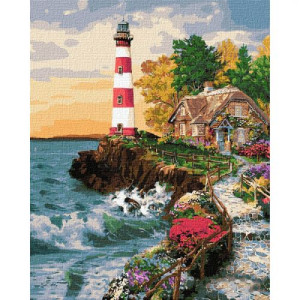 Картина по номерам 'Дом у маяка'. Для того, чтобы нарисовать картину, необходимо рисовать по пронумерованным контурам, которые соответствуют цвету краски. В наборе: натуральный холст на подрамнике с галерейной натяжкой, бумажная копия с контурным рисунком картины (на картине нанесена схема контуров изображения с нумерацией), 3 нейлоновые художественные кисти, палитра акриловых красок в контейнерах, крепление. Все необходимые краски уже в комплекте и не требуют смешивания. Размер: 40 х 50 см. Количество цветов: 36. Сложность - ★★★★★.