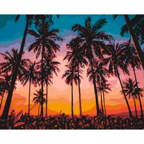 Картина по номерам 'Экзотический вечер'. Для того, чтобы нарисовать картину, необходимо рисовать по пронумерованным контурам, которые соответствуют цвету краски. В наборе: натуральный холст на подрамнике с галерейной натяжкой, бумажная копия с контурным рисунком картины (на картине нанесена схема контуров изображения с нумерацией), 3 нейлоновые художественные кисти, палитра акриловых красок в контейнерах, крепление. Все необходимые краски уже в комплекте и не требуют смешивания. Размер: 40 х 50 см. Количество цветов: 22. Сложность - ★★★★.