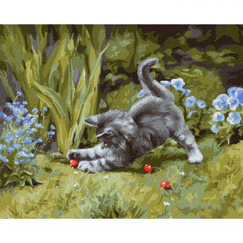 Картина по номерам 'Игривый котёнок'. Для того чтобы нарисовать картину, необходимо рисовать по пронумерованным контурам, которые соответствуют цвету краски. В наборе: натуральный холст на подрамнике с галерейной натяжкой, бумажная копия с контурным рисунком картины (на картине нанесена схема контуров изображения с нумерацией), 3 нейлоновые художественные кисти, палитра акриловых красок в контейнерах. Все необходимые краски уже в комплекте и не требуют смешивания. Размер: 40 х 50 см. Количество цветов: 22. Сложность - ★★★★.