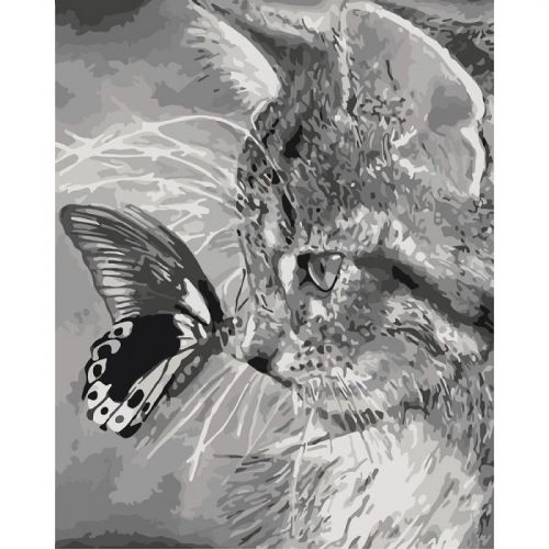 Картина по номерам 'Котенок и бабочка'. Для того, чтобы нарисовать картину, необходимо рисовать по пронумерованным контурам, которые соответсвуют цвету краски. В наборе: натуральный холст на подрамнике с галерейной натяжкой, бумажная копия с контурным рисунком картины (на картине нанесена схема контуров изображения с нумерацией), 3 нейлоновых художественных кисти, палитра акриловых красок в контейнерах, крепление. Все необходимые краски уже в комплекте и не требуют смешивания. Размер: 40 х 50 см. Количество цветов: 18.