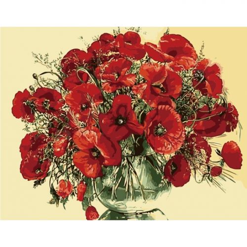 Картина по номерам 'Красные маки в стеклянной вазе'. Для того, чтобы нарисовать картину, необходимо рисовать по пронумерованным контурам, которые соответствуют цвету краски. В наборе: натуральный холст на подрамнике с галерейной натяжкой, бумажная копия с контурным рисунком картины (на картине нанесена схема контуров изображения с нумерацией), 3 нейлоновые художественные кисти, палитра акриловых красок в контейнерах, крепление. Все необходимые краски уже в комплекте и не требуют смешивания. Размер: 40 х 50 см. Количество цветов: 16. Сложность - ★★★.