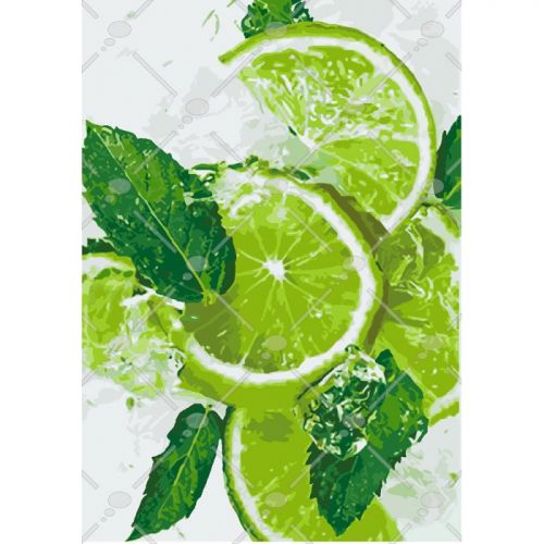Картина по номерам 'Лаймовый фреш'. Для того, чтобы нарисовать картину, необходимо рисовать по пронумерованным контурам, которые соответствуют цвету краски. В наборе: натуральный холст на подрамнике с галерейной натяжкой, бумажная копия с контурным рисунком картины (на картине нанесена схема контуров изображения с нумерацией), 3 нейлоновые художественные кисти, палитра акриловых красок в контейнерах, крепление. Все необходимые краски уже в комплекте и не требуют смешивания. Размер: 35 х 50 см. Количество цветов: 20. Сложность -★★★★.