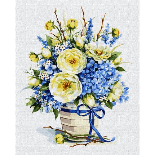 Картина по номерам 'Лазурный букет'. Для того, чтобы нарисовать картину, необходимо рисовать по пронумерованным контурам, которые соответствуют цвету краски. В наборе: натуральный холст на подрамнике с галерейной натяжкой, бумажная копия с контурным рисунком картины (на картине нанесена схема контуров изображения с нумерацией), 3 нейлоновые художественные кисти, палитра акриловых красок в контейнерах, крепление. Все необходимые краски уже в комплекте и не требуют смешивания. Размер: 40 х 50 см. Количество цветов: 31. Сложность - ★★★★★.