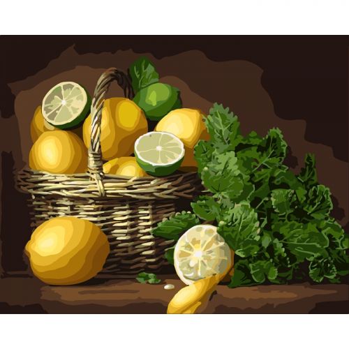 Картина по номерам 'Лимонное настроение'. Для того, чтобы нарисовать картину, необходимо рисовать по пронумерованным контурам, которые соответствуют цвету краски. В наборе: натуральный холст на подрамнике с галерейной натяжкой, бумажная копия с контурным рисунком картины (на картине нанесена схема контуров изображения с нумерацией), 3 нейлоновые художественные кисти, палитра акриловых красок в контейнерах, крепление. Все необходимые краски уже в комплекте и не требуют смешивания. Размер: 40 х 50 см. Количество цветов: 32. Сложность - ★★★.