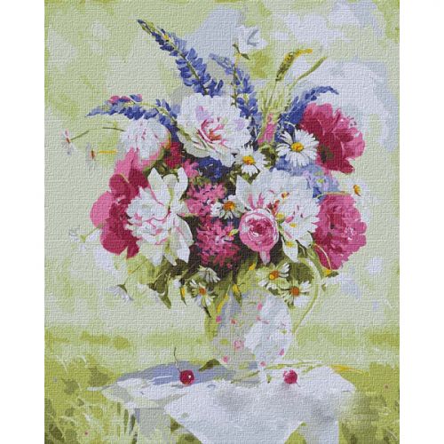 Картина по номерам 'Натюрморт с пионами и люпинами'. Для того чтобы нарисовать картину, необходимо рисовать по пронумерованным контурам, которые соответствуют цвету краски. В наборе: натуральный холст на подрамнике с галерейной натяжкой, бумажная копия с контурным рисунком картины (на картине нанесена схема контуров изображения с нумерацией), 3 нейлоновые художественные кисти, палитра акриловых красок в контейнерах. Все необходимые краски уже в комплекте и не требуют смешивания. Размер: 40 х 50 см. Сложность - ★★★★★.