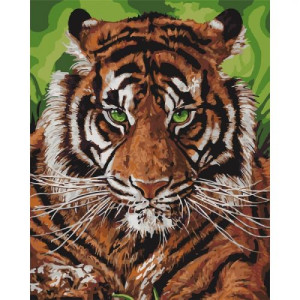 Картина по номерам 'Непобедимый тигр'. Для того, чтобы нарисовать картину, необходимо рисовать по пронумерованным контурам, которые соответствуют цвету краски. В наборе: натуральный холст на подрамнике с галерейной натяжкой, бумажная копия с контурным рисунком картины (на картине нанесена схема контуров изображения с нумерацией), 3 нейлоновые художественные кисти, палитра акриловых красок в контейнерах, крепление. Все необходимые краски уже в комплекте и не требуют смешивания. Размер: 40 х 50 см. Количество цветов: 20. Сложность - ★★★★.