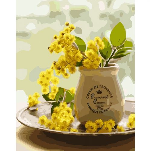 Картина по номерам 'Нежность мимозы'. Для того, чтобы нарисовать картину, необходимо рисовать по пронумерованным контурам, которые соответствуют цвету краски. В наборе: натуральный холст на подрамнике с галерейной натяжкой, бумажная копия с контурным рисунком картины (на картине нанесена схема контуров изображения с нумерацией), 2 нейлоновые художественные кисти, палитра акриловых красок в контейнерах, крепление. Все необходимые краски уже в комплекте и не требуют смешивания. Размер: 40 х 30 см. Количество цветов: 31. Сложность - ★★★.