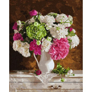 Картина по номерам 'Нежность в букете'. Для того, чтобы нарисовать картину, необходимо рисовать по пронумерованным контурам, которые соответствуют цвету краски. В наборе: натуральный холст на подрамнике с галерейной натяжкой, бумажная копия с контурным рисунком картины (на картине нанесена схема контуров изображения с нумерацией), 3 нейлоновые художественные кисти, палитра акриловых красок в контейнерах, крепление. Все необходимые краски уже в комплекте и не требуют смешивания. Размер: 40 х 50 см. Количество цветов: 39. Сложность - ★★★★★.