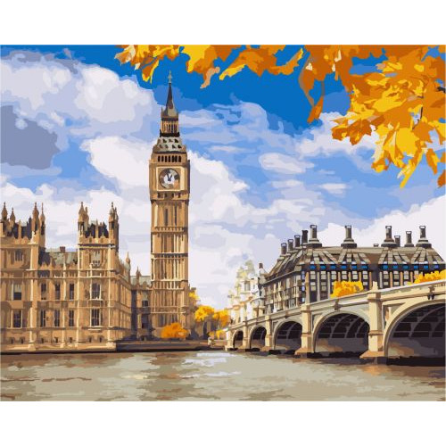 Картина по номерам 'Осенний Лондон'. Для того, чтобы нарисовать картину, необходимо рисовать по пронумерованным контурам, которые соответствуют цвету краски. В наборе: натуральный холст на подрамнике с галерейной натяжкой, бумажная копия с контурным рисунком картины (на картине нанесена схема контуров изображения с нумерацией), 3 нейлоновые художественные кисти, палитра акриловых красок в контейнерах, крепление. Все необходимые краски уже в комплекте и не требуют смешивания. Размер: 40 х 50 см. Количество цветов: 24. Сложность - ★★★.