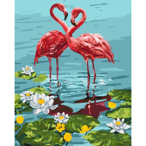 Картина по номерам 'Пара фламинго'. Для того, чтобы нарисовать картину, необходимо рисовать по пронумерованным контурам, которые соответствуют цвету краски. В наборе: натуральный холст на подрамнике с галерейной натяжкой, бумажная копия с контурным рисунком картины (на картине нанесена схема контуров изображения с нумерацией), 3 нейлоновые художественные кисти, палитра акриловых красок в контейнерах, крепление. Все необходимые краски уже в комплекте и не требуют смешивания. Размер: 40 х 50 см. Количество цветов: 30. Сложность - ★★★★.