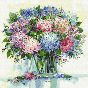 Картина по номерам 'Сказочный букет гортензий'. Для того, чтобы нарисовать картину, необходимо рисовать по пронумерованным контурам, которые соответствуют цвету краски. В наборе: натуральный холст на подрамнике с галерейной натяжкой, бумажная копия с контурным рисунком картины (на картине нанесена схема контуров изображения с нумерацией), 3 нейлоновые художественные кисти, палитра акриловых красок в контейнерах, крепление. Все необходимые краски уже в комплекте и не требуют смешивания. Размер: 50 х 50 см. Количество цветов: 33. Сложность - ★★★★★.