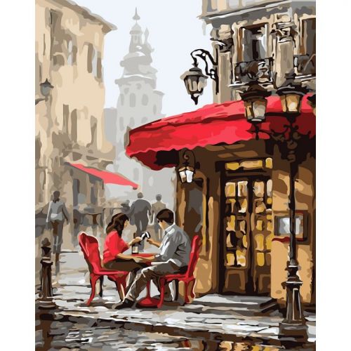 Картина по номерам 'Свидание в кафе'. Для того, чтобы нарисовать картину, необходимо рисовать по пронумерованным контурам, которые соответствуют цвету краски. В наборе: натуральный холст на подрамнике с галерейной натяжкой, бумажная копия с контурным рисунком картины (на картине нанесена схема контуров изображения с нумерацией), 3 нейлоновые художественные кисти, палитра акриловых красок в контейнерах, крепление. Все необходимые краски уже в комплекте и не требуют смешивания. Размер: 40 х 50 см. Количество цветов: 23. Сложность - ★★★.