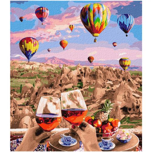 Картина по номерам 'Волшебная Каппадокия'. Для того, чтобы нарисовать картину, необходимо рисовать по пронумерованным контурам, которые соответствуют цвету краски. В наборе: натуральный холст на подрамнике с галерейной натяжкой, бумажная копия с контурным рисунком картины (на картине нанесена схема контуров изображения с нумерацией), 3 нейлоновые художественные кисти, палитра акриловых красок в контейнерах. Все необходимые краски уже в комплекте и не требуют смешивания. Размер: 40 х 50 см. Количество цветов: 35. Сложность - ★★★★.