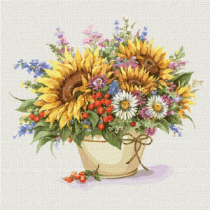 Картина по номерам 'Волшебные подсолнухи'. Для того, чтобы нарисовать картину, необходимо рисовать по пронумерованным контурам, которые соответствуют цвету краски. В наборе: натуральный холст на подрамнике с галерейной натяжкой, бумажная копия с контурным рисунком картины (на картине нанесена схема контуров изображения с нумерацией), 2 нейлоновые художественные кисти, палитра акриловых красок в контейнерах, крепление. Все необходимые краски уже в комплекте и не требуют смешивания. Размер: 40 х 40 см. Количество цветов: 36. Сложность - ★★★★★.