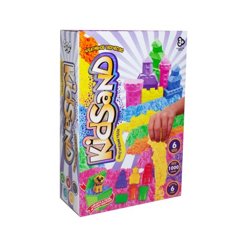 Кинетический песок 'KidSand' с формочками, 1000 г., 6 цветов. Такой песок прекрасно держит любую форму, быстро распадается при необходимости, а его строение отличается одновременно пористостью и прочностью. По ощущениям такой песок напоминает сырой морской песок, только он без воды, не прилипает к рукам, не пачкает одежду. В комплекте с песком идут 6 формочек и фигурка собачек.