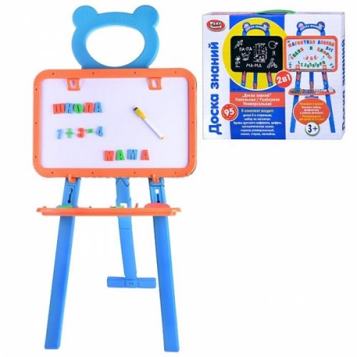Мольберт 'Доска знаний' 2 в 1. Напольная / Разборная. Готовимя к школе. Изучаем азбуку, арифметику и учимся рисовать. 2 стороны: белая магнитная и черная для мела. В наборе: доска, набор на магнитах - буквы русского алфавита, цифры, математические знаки (всего 95 шт.), маркер универсальный, мелки, стерка, наклейка.