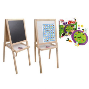 Двухсторонний деревянный мольберт. Одна сторона - белая, магнитная; другая - черная, для мела. Размер доски - 40 х 45 см. В наборе, кроме самого мольберта, есть:
