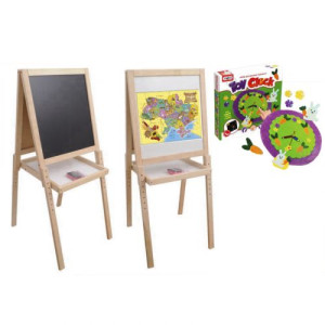 Двухсторонний деревянный мольберт. Одна сторона - белая, магнитная; другая - черная, для мела. Размер доски - 40 х 45 см. В наборе, кроме самого мольберта, есть: