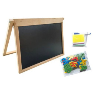 Настольный двусторонний мольберт. Есть магнитная основа. Подходит для фломастеров и мелков. Высота мольберта (с ножками) - 37 см. Размер рабочей области - 44х28 см. Выполнен из дерева. В комплекте есть фломастер, 6 мелков разных цветов, губка, магнитный украинский алфавит.