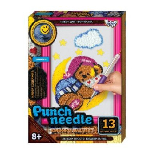 'Punch Needle' - это продергивание нити или ковровая вышивка. Для данной вышивки используют специальную иглу, нити мулине и холст с нанесённым с обратной стороны рисунком. Рисунок соответственно следует вышивать с изнанки. В комплекте: холст со схемой-рисунком для создания вышивки, багетная рамка, канцелярские кнопки, ручной ткацкий станок, комплект разноцветных ниток мулине, нитковдеватель и инструкция. 13 мотков ниток.