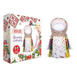 Набор для творчества 'Кукла-мотанка: Берегиня'. При изготовлении тряпичной куклы берутся только новые натуральные ткани, которые запрещается резать и прокалывать, но разрешается рвать на более мелкие части и приматывать их нитками друг к другу, в результате чего получается 'мотанка'.