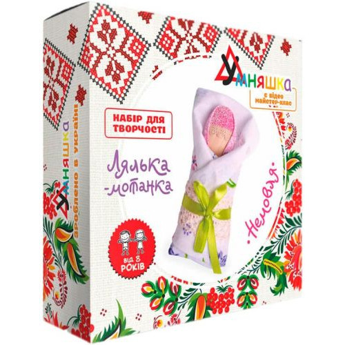 Набор для творчества 'Кукла-мотанка: Младенец'. При изготовлении тряпичной куклы берутся только новые натуральные ткани, которые запрещается резать и прокалывать, но разрешается рвать на более мелкие части и приматывать их нитками друг к другу, в результате чего получается 'мотанка'.