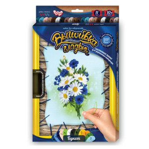 Комплектация: Холст-заготовка с рисунком, багетная рамка, нити мулине, игла, схема-подсказка, инструкция, кнопки