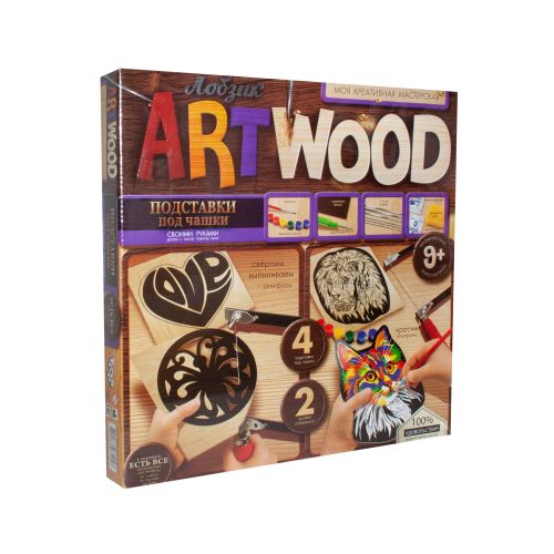 Набор для выпиливания 'ARTWOOD: Подставки под чашки'. Набор, предназначенный для развития техники художественного выпиливания лобзиком и освоения старинного ремесла. Процесс состоит из 6 этапов: 1) Выпиливания/сверление. 2) Отделка изделия. 3) Грунтовка. 4) Покраска. 5) Лакирование. 6) Сушка. 2 уровня сложности, 4 подставки.