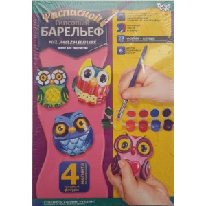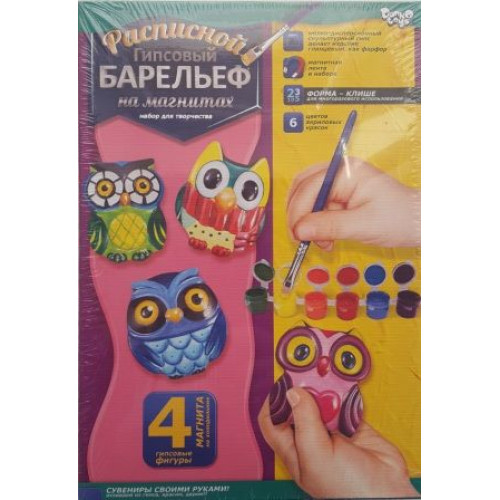 Набор для творчества 'Расписной барельеф на магнитах'. Для начала, готовим гипсовый раствор, затем заливаем его в формочки (4 фигуры). После того как раствор застынет, нужно приклеить магнитную ленту на обратной стороне фигурки. Последний шаг - раскрашивание фигурок (краски и кисточка в комплекте).
