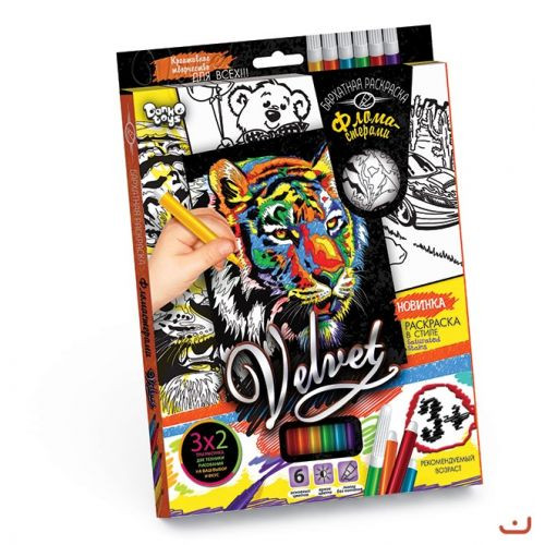 Набор креативного творчества 'Бархатная раскраска фломастерами VELVET '. Сочетание объемного черного бархата и ярких цветов фломастеров, создает неповторимый эффект и развивает художественный вкус. Три рисунка разного размера (14,8 х 21 см, 20,5 х 26 см и 14,8 х 21 см). 6 фломастеров.