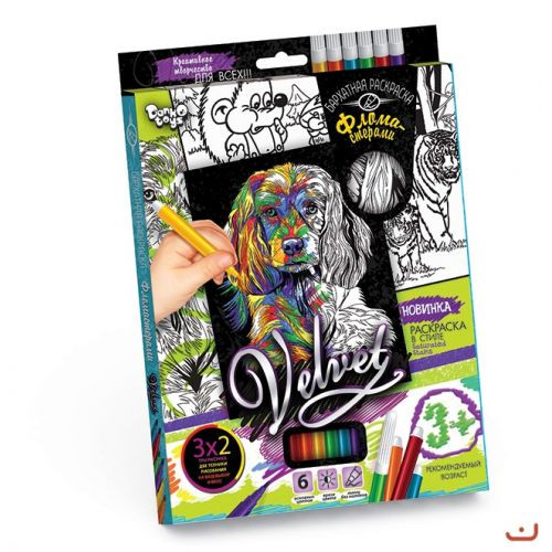Набор креативного творчества 'Бархатная раскраска фломастерами VELVET '. Сочетание объемного черного бархата и ярких цветов фломастеров, создает неповторимый эффект и развивает художественный вкус. Три рисунка разного размера (14,8 х 21 см, 20,5 х 26 см и 14,8 х 21 см). 6 фломастеров.