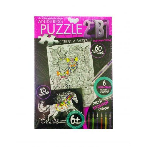 Пазл-раскраска 'Антистресс'. Набор включает 2 картинки-пазла из 20 и 60 деталей соответственно. Собери и раскрась пазлы. 6 неоновых гелиевых стержней разных цветов в комплекте.