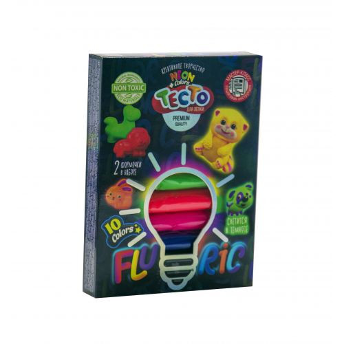 Тесто 'Fluoric' - это набор креативного творчества, уникальность которого состоит в составе материала и его удивительной способности - светится в темноте. 10 цветов теста (по 15 г), 2 формочки и стек в наборе