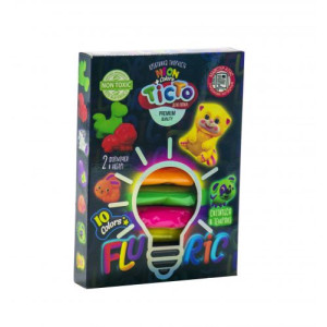 Тесто 'Fluoric' - это набор креативного творчества, уникальность которого состоит в составе материала и его удивительной способности - светится в темноте. 10 цветов теста (по 15 г), 2 формочки и стек в наборе