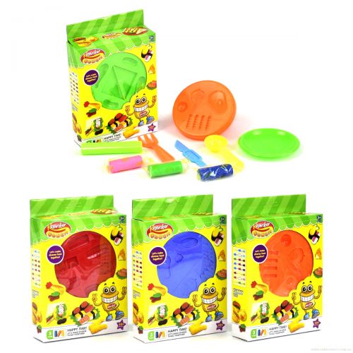 Комплектация: 3 брусочка разноцветного теста, аксессуары для работы с ним, посуда