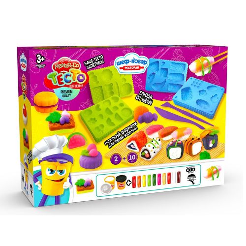В набор входит все, что необходимо начинающему сушисту. В комплекте есть: тесто для лепки - 10 брикетов, тесто для лепки - 2 баночки, формочки для лепки - 4 шт., комплект стеков, коврик - 1 шт, палочки для суши, инструкция - 1 шт. Выполнено из качественных и безопасных материалов. Для детей от 3-х лет.