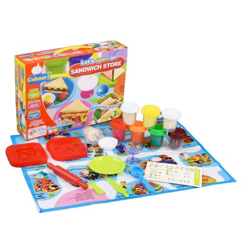 Набор теста для лепки 'Сэндвич-бар'. В комплекте: 8 баночек с тестом (70 г), на крышках баночек есть формочки в виде различных предметов, 2 досточки с формочками, вилка, ложка, нож, скалка, миска, мороженица, скатерть и инструкция.