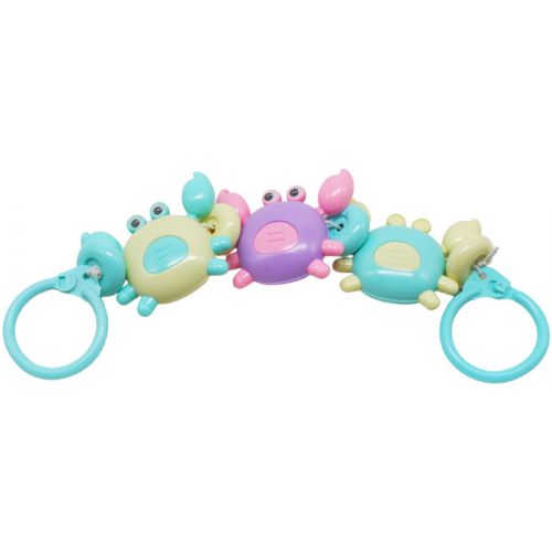 Яркая разноцветная погремушка 'Крабы'. Может фиксироваться на коляску ребенка при помощи специальных колечек. Выполнена из качественных безопасных материалов. Размер: 40х7 см.
